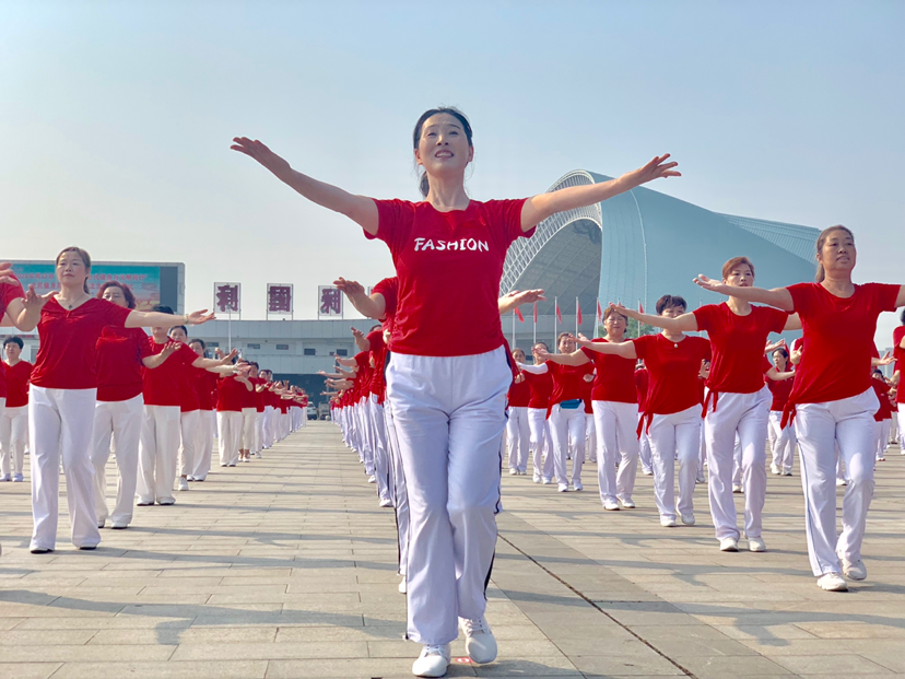 在活動現場,身穿紅色上衣,白色長褲的廣場舞愛好者隨著音響里傳來的指令,面帶笑意舞動著。