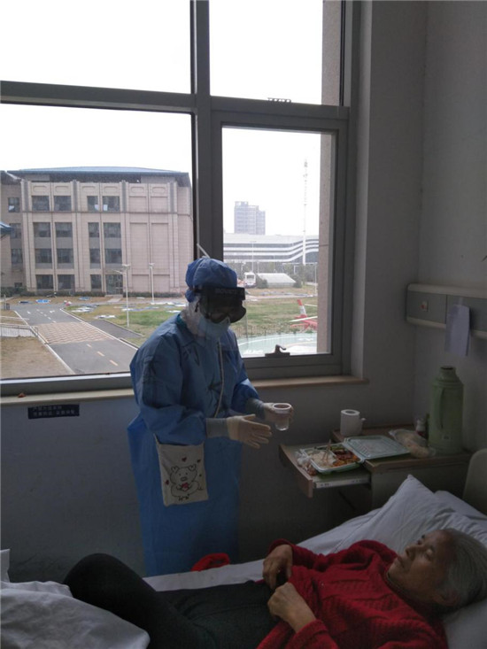 因為新冠肺炎不少患者都是老人,加上基礎疾病較重,不少患者生活不能自理。因為強感染性不允許家屬照顧,在病區,胡奔奔需要經常為患者擦洗身體、處理大小便問題,處理排泄物、打掃病房衛生消毒也成為她在重癥病區里常見的工作,需要付出比平常工作更多的精力來執行這繁重的勞動,而且要在穿戴著防護裝備的笨拙情況下,體力消耗更大。