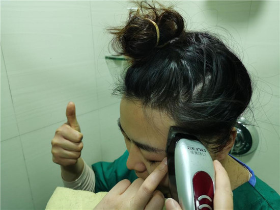 出征武漢之前,為減少感染自己、感染別人的風險,出生于1991年、和同齡人一樣愛美的胡奔奔毅然決定同意剃去一襲披肩長發。這頭秀發,胡奔奔留了多年,曾經看得跟生命一樣珍貴,但疫情險惡,她義無反顧。