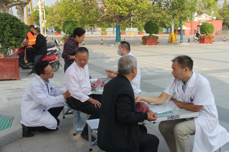 義診活動現場,通過懸掛主題宣傳橫幅、擺放健康知識宣傳展板、設置義診咨詢服務臺、發放健康促進宣傳折頁等方式為群眾進行健康知識宣教。前來咨詢就診的群眾絡繹不絕,醫務人員熱情地為群眾提供免費測量血壓、血糖等服務,耐心細致地解答群眾健康咨詢并給予診療建議,提醒平時多多加強鍛煉,注意健康飲食。