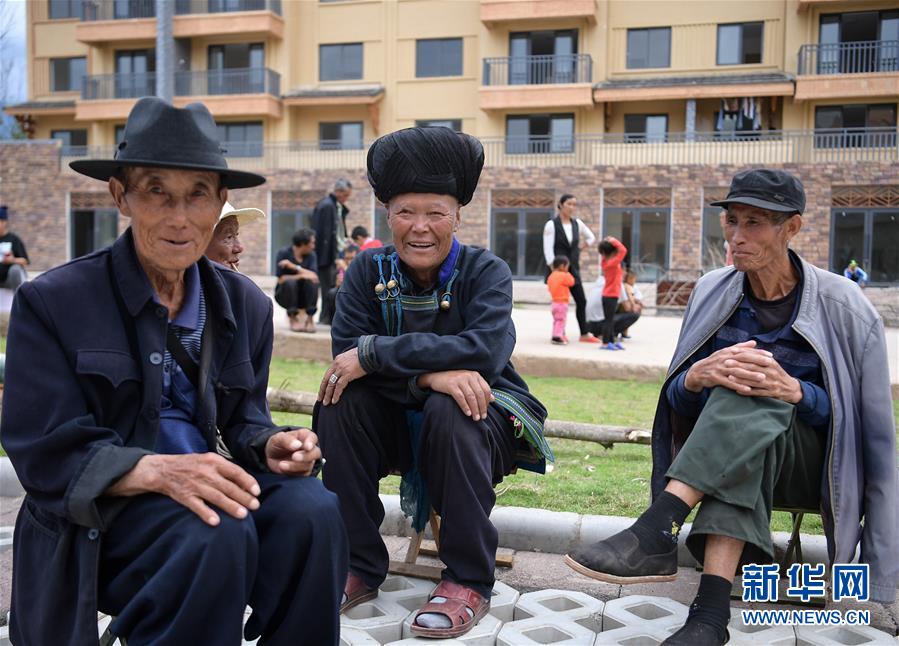 搬下山的人們,住進了有彝族傳統建筑風格的新社區,老人們常聚在街邊休閑(8月11日攝)。 新華社記者 李賀 攝