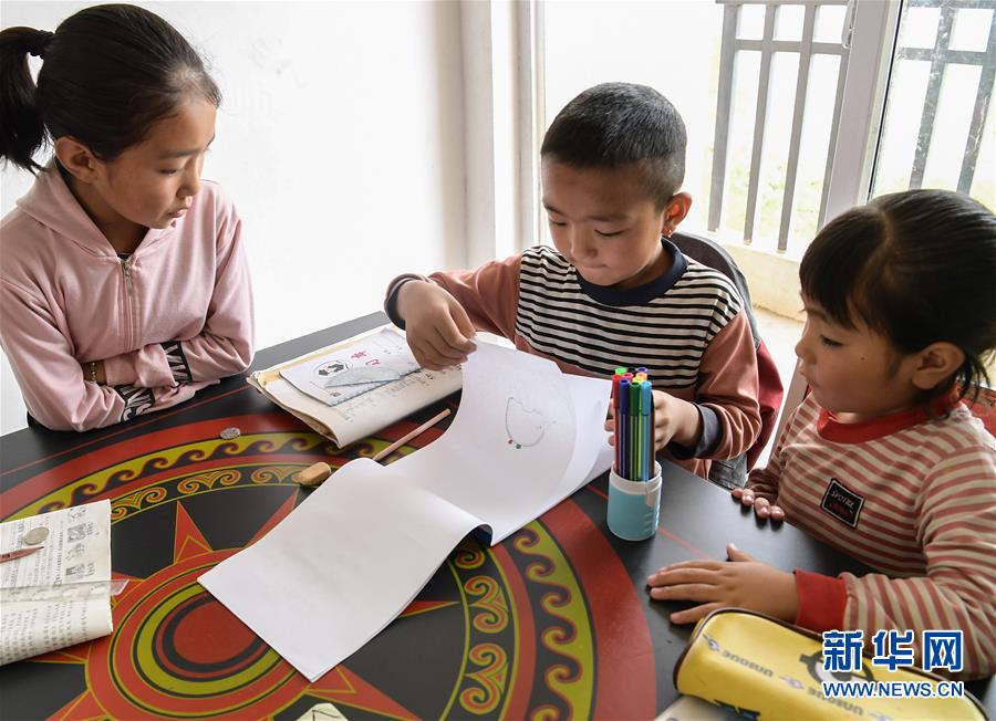 昭覺縣城城郊集中安置點南坪社區內,一戶彝族群眾家中的孩子圍坐在書桌旁畫畫(8月11日攝)。 新華社記者 李賀 攝