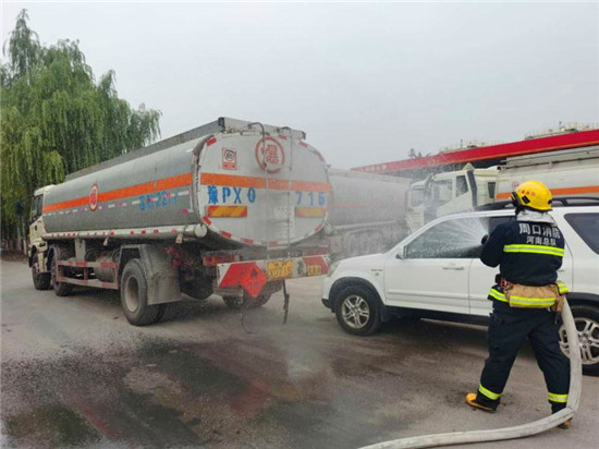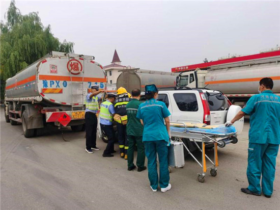 當日上午10時,商水交警大隊指揮中心接到報警:在商水縣興商大道與陳勝大道交叉口西、湯莊油庫處,一輛轎車與一輛危化品罐車追尾相撞,正常罐體損壞,?;沸孤镀鸹?,轎車駕駛室變形,駕駛人被困車內,如不及時救援,駕駛人有生命危險,另外因事故現場臨近湯莊油庫,如不及時處置可能發生爆炸,后果不堪設想。