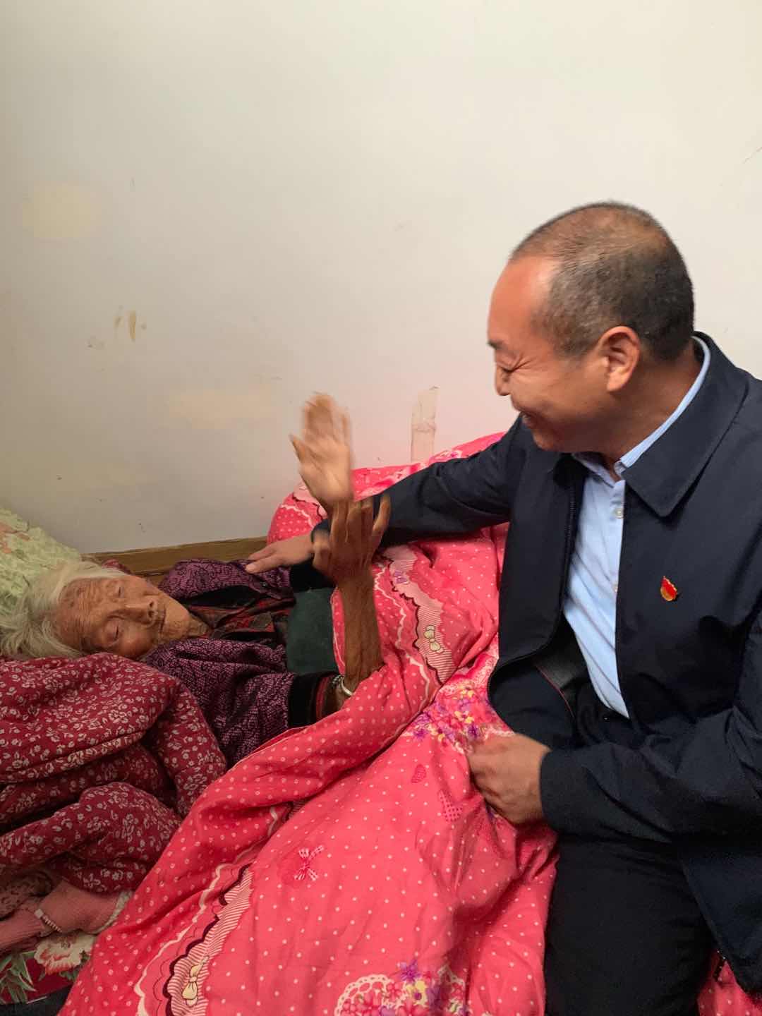 這天,方凱一行帶著嶄新的棉衣、大米、食用油等禮品,首先來到磨臺(tái)村看望107歲的老人胡有蘭。躺在床上的老人雖年逾百歲,一眼看見方凱,就認(rèn)出來了,激動(dòng)地說:“孩子,你又來了?”說著,就急忙拉住方凱的手,緊緊地握著。看老人不方便坐起來,方凱便坐在老人身邊,笑著說:“是的。娘,兒子來看您啦!”