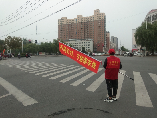 10月12日,記者在周口中心城區(qū)交通大道與建安路交叉口看到,幾名志愿者手中的小紅旗“加長(zhǎng)了”,上面還寫有“不闖紅燈,不越停車線”的溫馨提示語(yǔ)。路過此處,不少市民把目光投在了這個(gè)加長(zhǎng)的小紅旗上,有的還輕聲讀出紅旗上的標(biāo)語(yǔ)。通過這些溫馨提示語(yǔ),讓市民在潛移默化中逐漸增強(qiáng)文明出行的意識(shí)。記者 張洪濤 攝 ②5