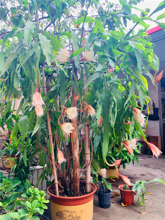 在周口市中心城區的一個家屬院里,記者見到了88歲的苗天才和他養的曇花,“一株21年樹齡的曇花開了43朵,另外兩株5年樹齡的曇花加起來開了13朵,這3株曇花一共開了56朵。”苗天才說,早上四五點的時候曇花就慢慢地開放了,到現在五六個小時過去了曇花還保持著開放狀態。