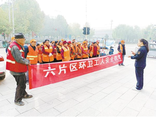 為保障環衛工人的安全,項城市城管局每周二定期對環衛工人開展安全教育,提醒環衛工人霧天不上主干道、掃地順車道、過馬路注意信號燈等,增強了環衛工人的安全交通意識。圖為項城市城管局六片區負責人為環衛工人講解安全知識。