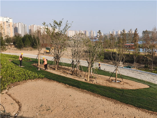 11月11日,在中心城區沙潁河北岸周口大道至八一大道段生態改造工程EPC項目施工現場,施工人員正在進行地被植物的種植、綠化樹木的養護。