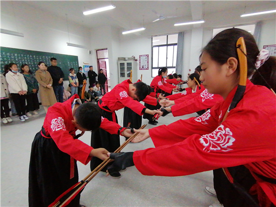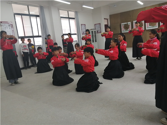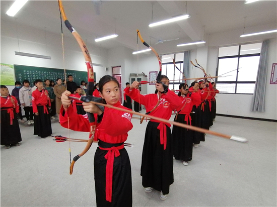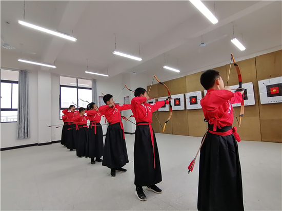在皮營學校活動室,學校舞蹈社團的小朋友展示了傳統儀式《鹿鳴》,深情的演繹,展示了他們對國學經典的理解。禮射是禮樂文明重要組成部分,習射先習禮,射以觀德。習射可以強健體魄,其中還蘊含了眾多古人先賢的智慧。皮營學校禮射興趣班的小朋友進行禮射表演,隨著挾矢,正筈,審固,舉弓,引彀,發矢,斂弓,執弦等一系列指令,拈弓搭弦展示禮射八法。在這里,學生們通過不同方式的展示,詮釋自己對“禮”“樂”的理解和認知。