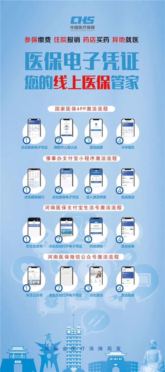 醫保電子憑證不依托實體卡,領取方式簡單,參保人員可以直接通過國家醫保App或者通過微信、支付寶,以及經由國家醫保局和河南省醫療保障局認證授權的第三方渠道,自助進行認證后激活使用,不需要到服務大廳領取和激活。