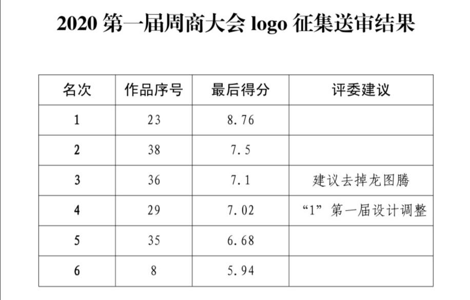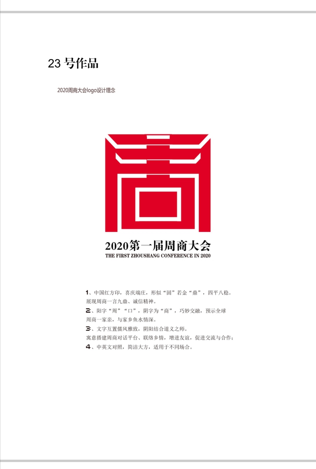 自11月12日起面向社會公開征集第一屆周商大會主題會標,截至11月19日24:00時,大會工作組共征集到來自10個省轄市的作品67件。11月20日上午10:00時,對作品進行統一編號后,經專家評審團評審出55幅進入評選,經逐項打分初評出6件作品,最后按綜合得分前三名作品入圍。