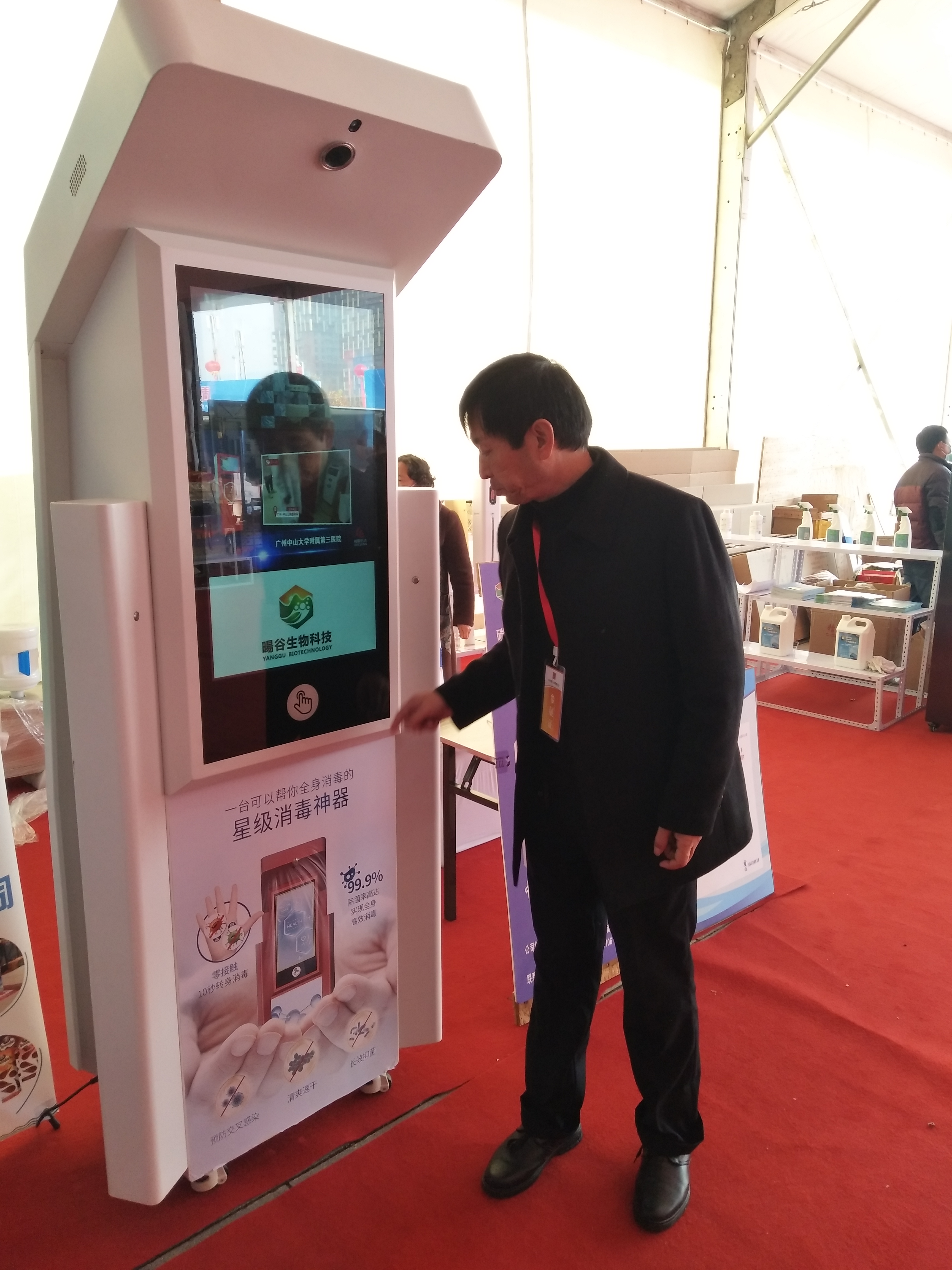手掌往感控區上輕輕一罩,液晶屏四角就噴出霧化消毒液,大概持續10秒,足夠人轉一圈做周身消毒——在周商產品展示展覽大廳的西南角,北京陽谷生物科技有限公司市場部總監 、項城人張清峰在介紹“人體感應消毒機”,引得市民紛紛圍觀體驗。由于消毒液沒有異味,部分市民質疑是清水,對此張清峰說:“我們用的是‘竹芳牌’碳酸型微酸性次氯酸消毒液,我們的消毒機主要是面向校園推廣的,給孩子用的東西除了要有效,還得保證安全溫和,碳酸型的消毒液就沒有這么大的刺激性。”據張清峰介紹,“人體感應消毒機”是今年五月下旬生產的新品,目前處在推廣階段,“當得知周口要辦第一屆周商大會的消息,我第一時間想到要把消毒機展示給家鄉父老。我是個在北京打拼十多年的項城人,目前河南分公司由我負責,項城市政府給了我很多支持。”
