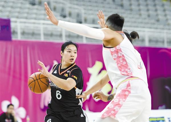 12月1日,東莞新彤盛隊球員沈怡(左)在比賽中突破。