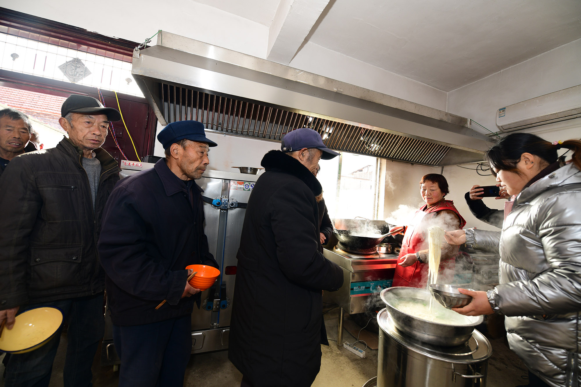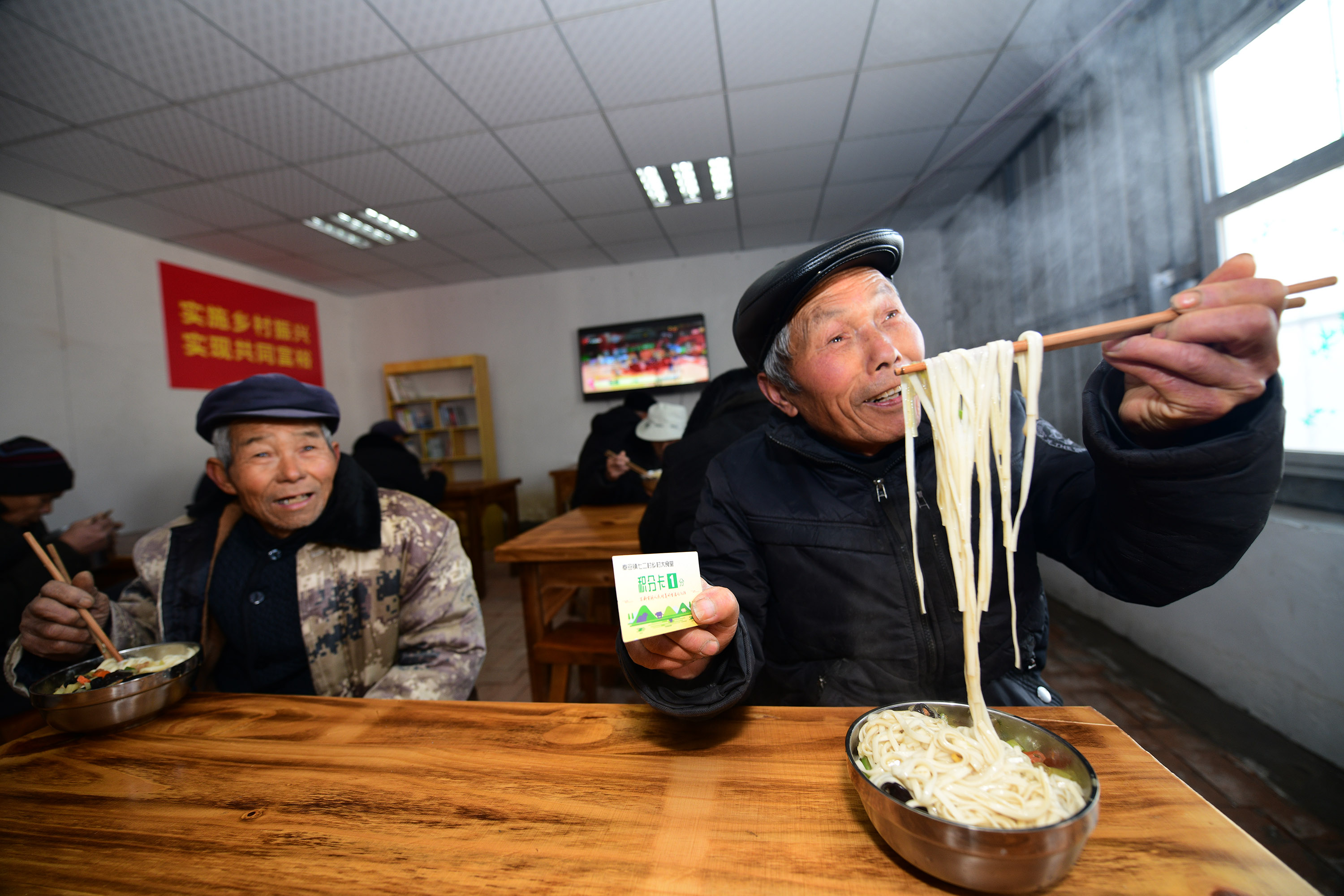 兩個月前,經(jīng)過籌備,七里倉二村的村食堂建成,大鍋飯開伙。食堂設(shè)在一家去世的五保戶家里。村里將房子內(nèi)外粉刷一遍,還買來了廚具、桌椅。做大鍋飯的是村里的兩名留守婦女。記者于12月15日中午趕來時,村食堂正開飯,老人們憑票打飯,午飯是臊子面。老人每人端一碗,來到飯廳就餐。這里有村里裝的電視,大家邊聊天邊吃飯邊看電視,其樂融融。