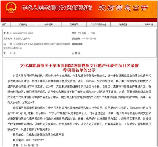據了解,2019年,文化和旅游部開展了第五批國家級非物質文化遺產代表性項目推薦申報工作。2020年,文化和旅游部組織專家對全國31個省、自治區、直轄市和新疆生產建設兵團,香港特別行政區、澳門特別行政區,以及中央和國家機關部門推薦申報的943個項目進行了評審。之后,第五批國家級非物質文化遺產代表性項目評審委員會進行了審議,提出第五批國家級非物質文化遺產代表性項目名錄推薦項目337項,其中,新列入198項,擴展139項。