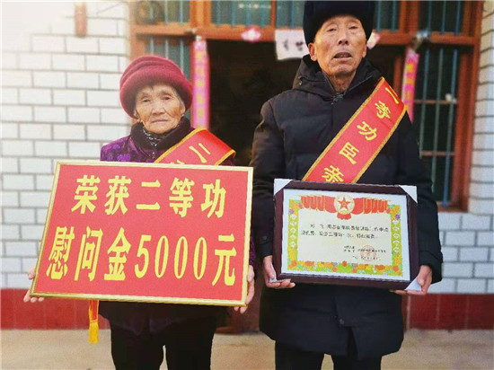 近日,周口市淮陽區(qū)人武部與區(qū)退役軍人事務局相關領導,來到該區(qū)四通鎮(zhèn)孔北行政村劉莊村,為在部隊榮立二等功的現(xiàn)役軍人劉飛的父母送去立功喜報,并送上慰問品及慰問金。臨走,劉飛的父親劉啟來說:“請領導放心,俺會讓孩子在部隊更加安心服役,力爭取得更大成績,多為家鄉(xiāng)增光添彩?!保◤埲?張雙斌 攝影報道)