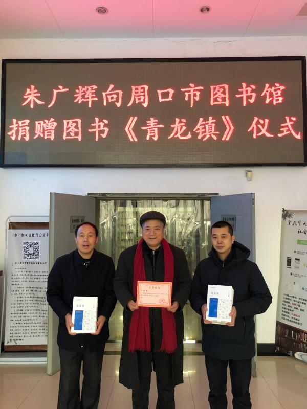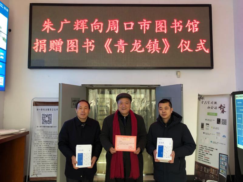 市圖書館館長李佳說,朱廣輝是我市知名作家,他一直致力于文化事業,為推動和宣傳周口文化做出了一定貢獻。朱廣輝將《青龍鎮》小說集捐贈給市圖書館,體現了他濃濃的問人情懷和作為作家的社會擔當。市圖書館希望我市作家廣泛參與捐贈,發揮圖書傳承文化、傳遞文明價值,進一步推進我市文化自信。②9