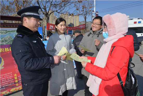 為迎接第35個“110宣傳日”的到來,1月9日,扶溝縣公安局組織民警在人民公園廣場開展“一心為民110,砥礪奮進新征程”為主題宣傳活動。民警通過現場發放宣傳資料、法律宣傳、警民互動等方式介紹110社會聯動常識,教群眾如何提升冬季安全防范知識,進一步密切警民關系。圖為民警向過往群眾發放宣傳資料。