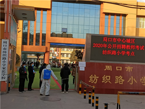 1月10日,周口市中心城區2020年公開招聘教師考試,考試時間是一天。當天下午,記者在周口市中心城區2020年公開招聘教師考試紡織路小學考點看到,工作人員在做好考務工作的同時還做好疫情防控工作。圖為工作人員做防疫消殺。