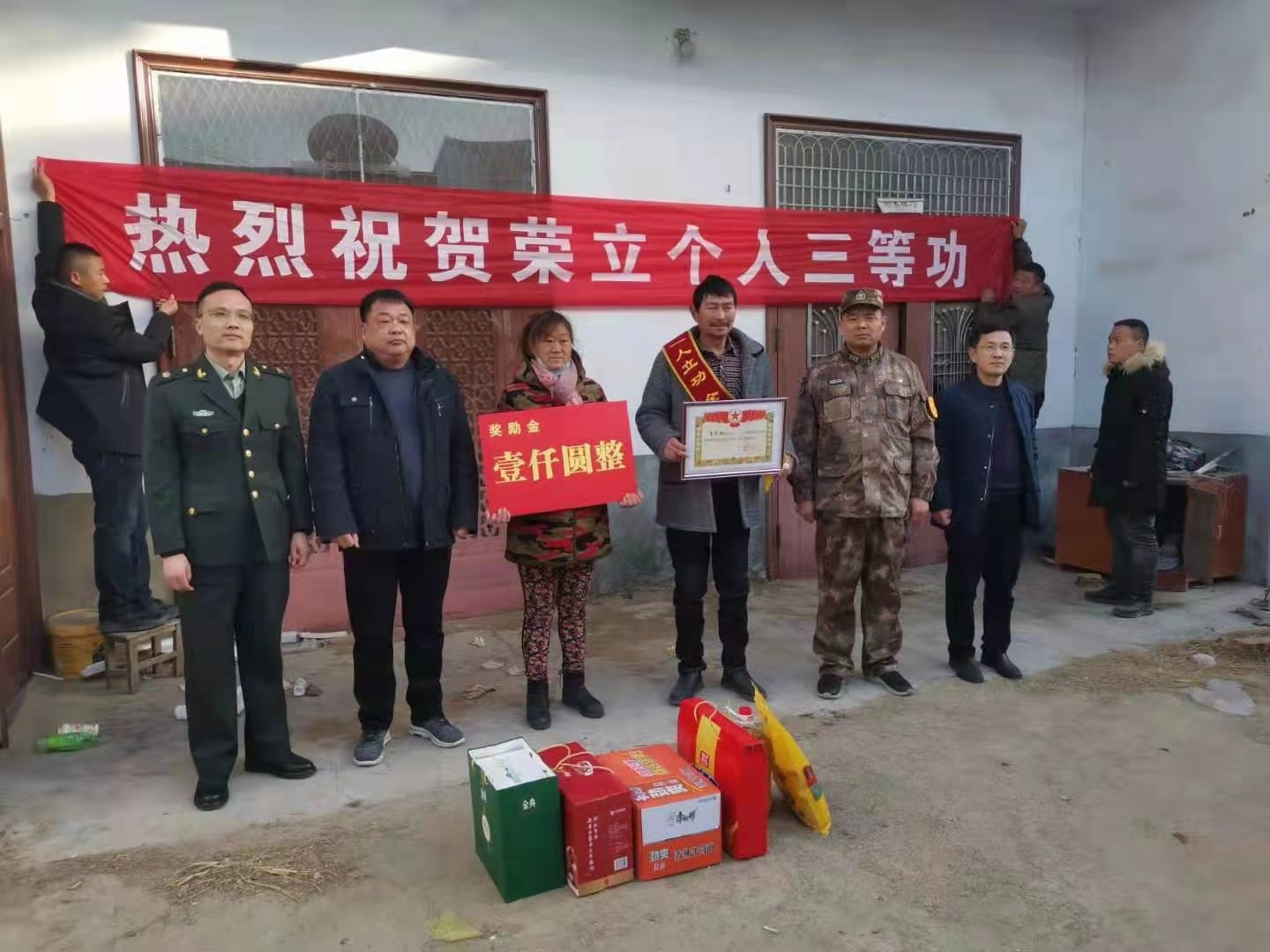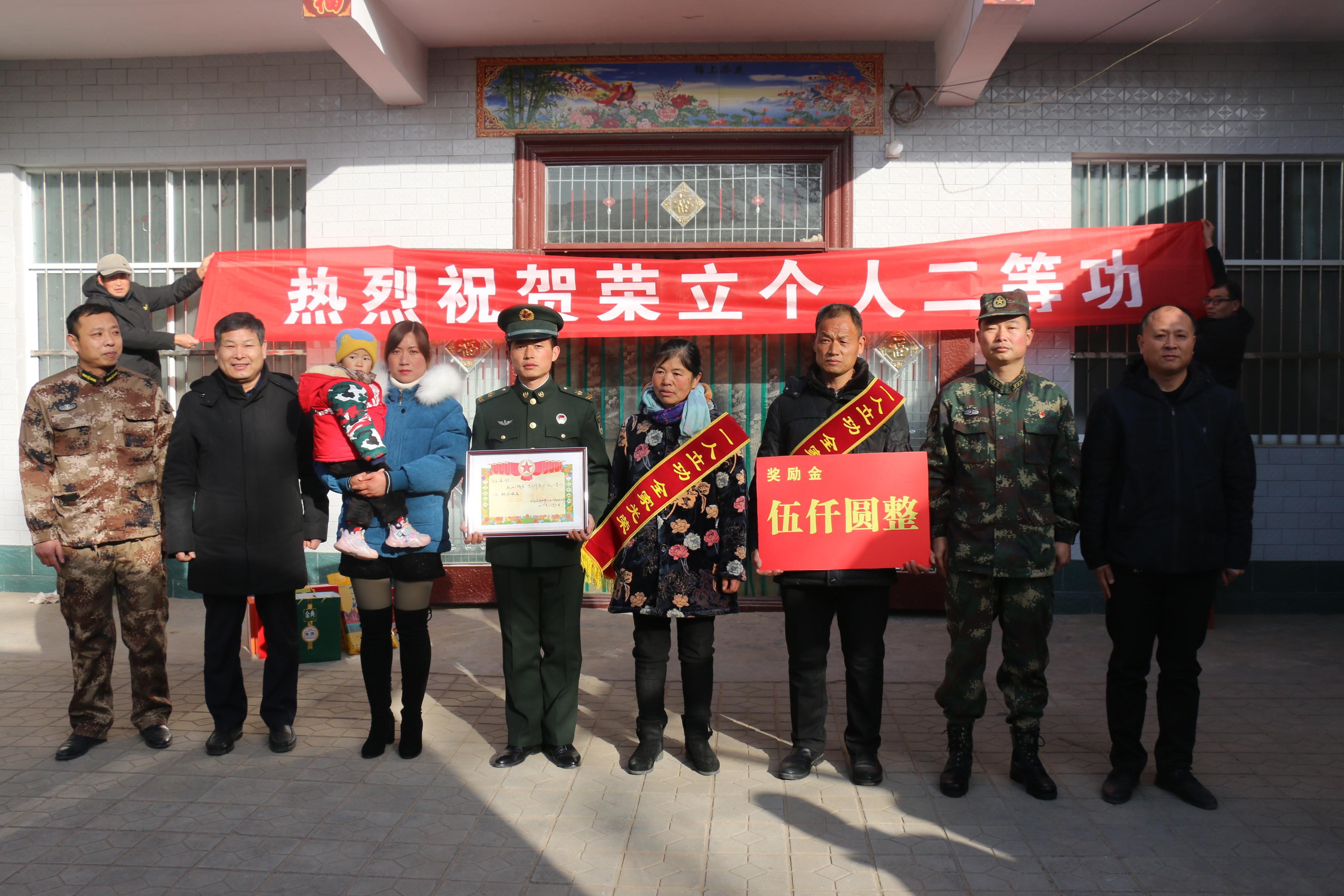 1月12日上午,西華縣西華營鎮雙樓村某部士官高志豪家中鑼鼓喧天,喜氣洋洋。該縣人武部政委涂友佳、縣退役軍人事務局局長龔坤敬一起把二等功喜報和“一人立功,全家光榮”的紅色綬帶及5000元現金等送到高志豪及其父母手中。