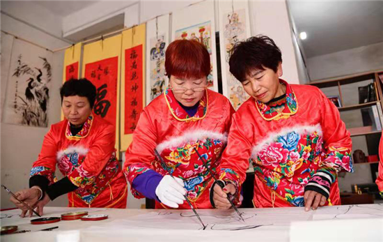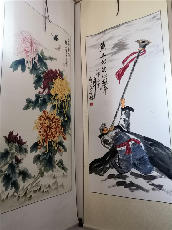 在建豪工作室的斜對(duì)面,是50歲村黨支部書(shū)記、村文聯(lián)主席盧全禮的書(shū)畫(huà)工作室。盧全禮書(shū)畫(huà)兼擅,還會(huì)武術(shù)、木刻、舞獅子,是附近有名的才子。記者看到,他為太康縣第二屆農(nóng)民豐收節(jié)創(chuàng)作的中國(guó)畫(huà)《黃土地的心聲》,以該村嗩吶吹奏藝人幸福而夸張的演出情景,歌頌農(nóng)村脫貧攻堅(jiān)取得的巨大成果,極具鄉(xiāng)土氣息。在他的畫(huà)室,滿身文藝范兒的五西村民,正以新時(shí)代松鶴延年吉祥農(nóng)民畫(huà),齊心打造中原畫(huà)鶴第一村。經(jīng)過(guò)培訓(xùn)的農(nóng)村大嫂大媽執(zhí)筆齊描畫(huà),一時(shí)鶴鳴九皋,翩翩欲飛。