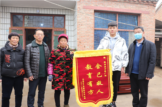 得知張廣坤所在學(xué)校的領(lǐng)導(dǎo)和老師要來村子,被救4歲男孩張子豪的奶奶帶著事先制作的錦旗來到張廣坤家說,原本打算把錦旗送到學(xué)校,感謝陳州高中培養(yǎng)出廣坤這樣的好學(xué)生,是廣坤救了他們?nèi)摇Kf,事發(fā)當(dāng)天下午5時,她在家做晚飯,一不留神,4歲的孫子獨(dú)自抱住球出門跑到村坑塘邊的空地上玩耍去了。玩耍中,孩子不慎將球踢進(jìn)了水塘。“4歲的孩子能懂啥,光想著撈他的皮球,水至脖頸,害怕了哭喊起來。當(dāng)日,附近沒有人,孩子身上又穿著襖,要不是被廣坤及時發(fā)現(xiàn),俺家的日子以后真沒法過。”講到這,男孩的奶奶直掉眼淚。