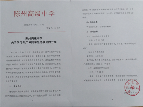 據(jù)陳州高中校長白子興介紹,該校已經(jīng)向全校師生發(fā)起學(xué)習(xí)張廣坤先進(jìn)事跡的倡議,以助人為樂為榮,熱心主動幫助他人。學(xué)校還將通過組織專題德育課、開展演講征文活動等,深入持久開展學(xué)習(xí)榜樣活動。