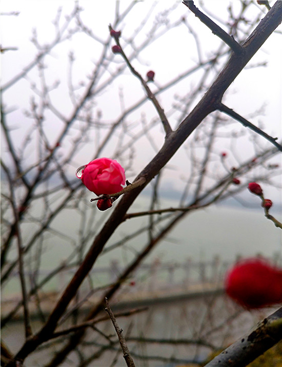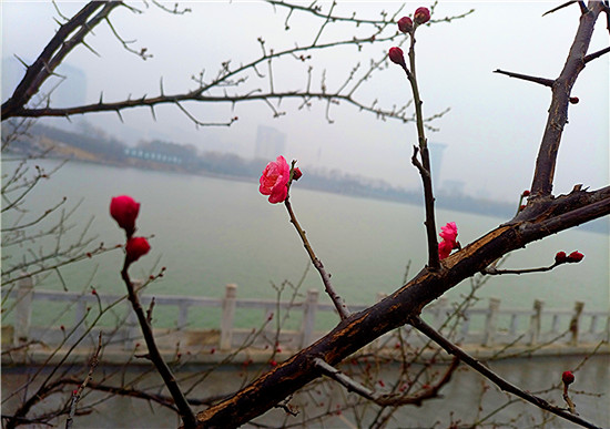 1月25日早晨,我市下了一場小雨。周口公園的梅樹上,幾朵梅花已經綻放枝頭,被雨水滋潤過后的梅花嬌艷,凝結在梅花上的小水珠晶瑩剔透,讓梅花變得別有一番詩意。