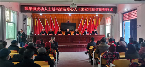1月29日,天氣乍暖還寒,魏集鎮(zhèn)政府人頭攢動,喜氣洋洋,一片熱鬧的景象。內(nèi)蒙古希拉穆仁旅游置業(yè)開發(fā)有限公司董事長、內(nèi)蒙古楊子照明鋼桿制造有限責(zé)任公司董事長、內(nèi)蒙古周口商會會長趙書清和愛心人士朱富偉一行,帶著整整兩卡車米、面、油共計八萬元生活物資,回到家鄉(xiāng)魏集鎮(zhèn)開展扶貧濟困活動,在嚴(yán)寒的冬日給魏集鎮(zhèn)困難群眾帶來了溫暖和祝福。縣政協(xié)主席孫培忠,縣委常委、宣傳部長李本磊出席活動。魏集鎮(zhèn)黨委書記衛(wèi)春忙,鎮(zhèn)長劉艷光參加活動。