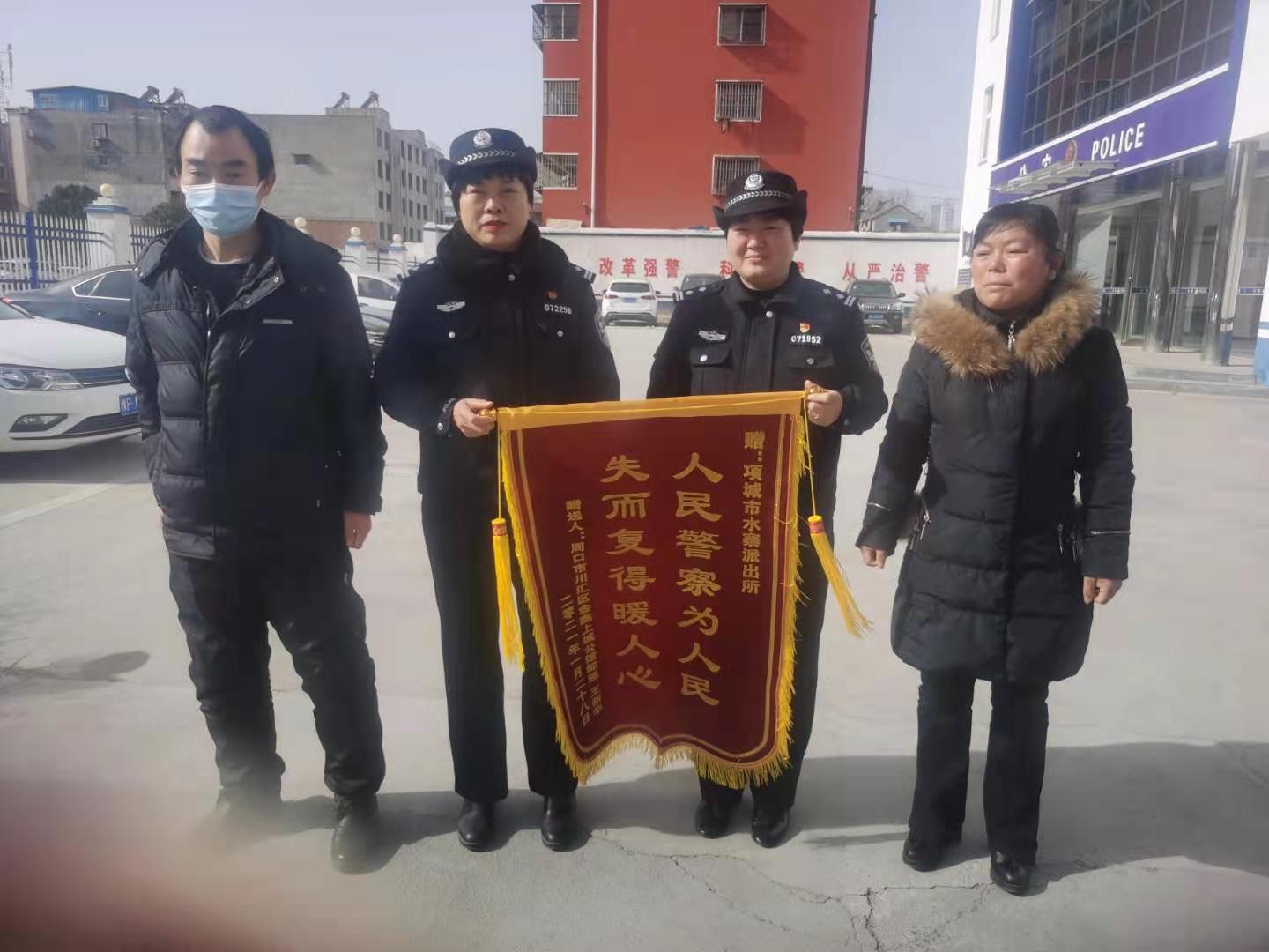 1月28日上午,鄒某夫婦手持一面 “人民警察為人民 失而復得暖人心”的錦旗,來到項城市公安局水寨派出所,向所長韓莉等民警表示感謝。