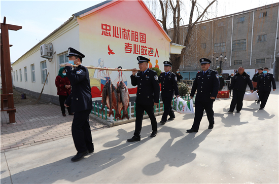 隨著春節日益臨近,該派出所所長楊杰和大家商議,“送溫暖送祝福”活動,應該先從尊老愛幼開始。于是,民警們購買了60斤魚、100斤雞蛋和2袋面粉,利用中午休息時間來到敬老院,給老人們送上新春祝福。