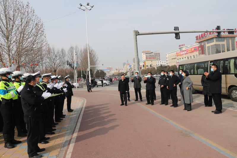 在縣人民廣場,最后王國璽、李錫勇一行看望慰問了正在執勤的交警,與他們親切交談,對大家一年來作出的努力和貢獻表示感謝。勉勵廣大干警發揚甘于奉獻、勇于擔當的精神,維護好全縣社會大局穩定,確保全縣人民度過一個歡樂祥和的節日。