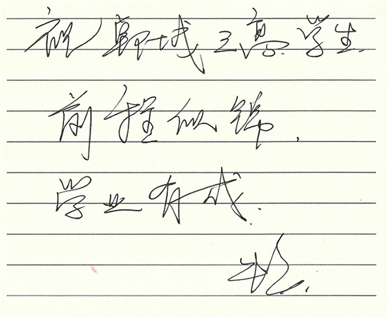 朱婷雖然很少回家,但是一直關注老家鄲城的發展變化,特別關注鄲城的教育發展,當她得知鄲城三高率先提煉出“孝、勤、韌、忠、濟”為核心的朱婷精神,并把這種精神作為鄲城三高學子的精神引領時非常感動,為鄲城三高始終堅持立德樹人的教育理念而高興,為鄲城三高學子的拼搏進取精神而欣慰,為鄲城三高辦學成果而點贊,并欣然寫下:“ 祝鄲城三高越來越好,圓農家子弟大學夢;祝鄲城三高學生前程似錦,學業有成?!?/p>