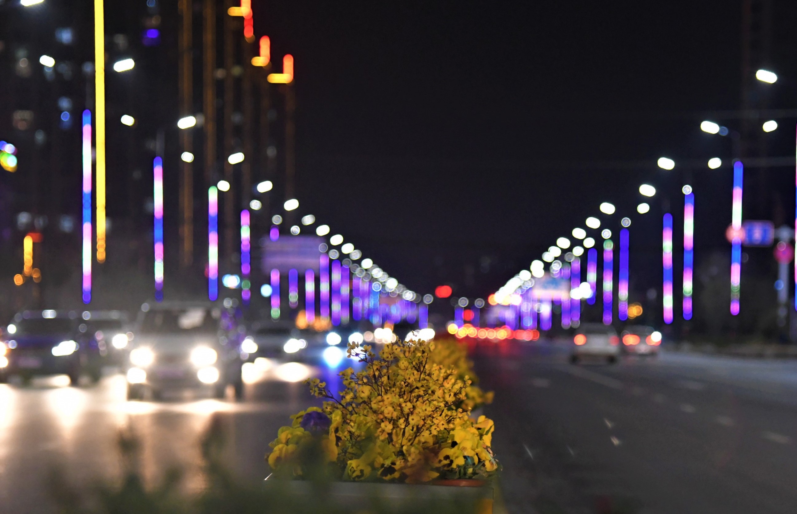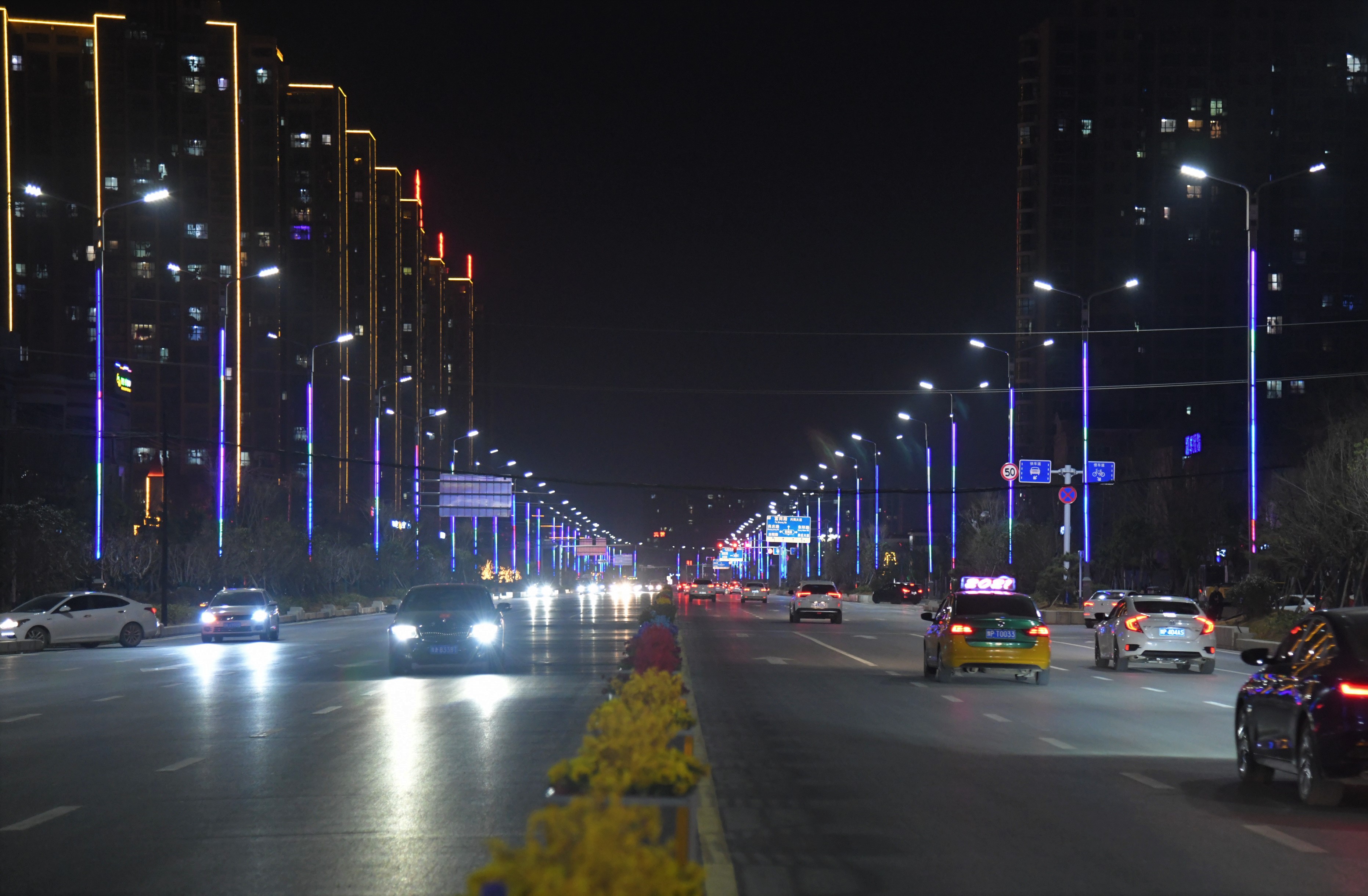 2月19日晚上,五彩斑斕的燈光閃耀在周商大道上,在光與影的世界里,商水縣城被打扮得多姿多彩。