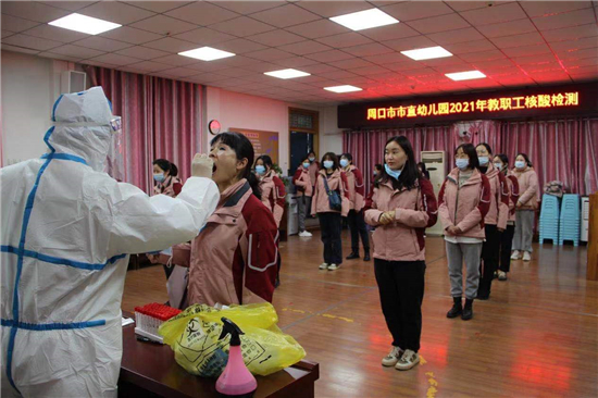 為保證市直幼兒園順利開學,按照市教體局統(tǒng)一安排部署,近日,周口市婦女兒童醫(yī)院核酸檢測組對市直幼兒園全體教職工百余人順利進行了新冠肺炎核酸檢測,檢測結果在校老師全部健康,無異常。圖為市直幼兒園教職工在進行新冠肺炎核酸檢測。