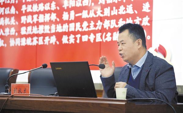 2月26日下午,商水縣舉行學黨史國史紅色教育大講堂活動。商水籍北大學子劉水龍結合史料,精彩講述賀龍北伐在商水播下革命火種、彭雪楓經周口東進豫皖蘇燃起商水革命烈火、豫皖蘇軍區解放周口商水浴火重生,以及火熱革命中涌現出來的商水英烈艾力、趙海靜,支前模范徐乃貞等人的英勇事跡。這些生動鮮活的歷史人物故事,再現了英雄兒女在商水大地上勇于革命、不怕犧牲的紅色革命歷史。劉水龍用豐富的史實、鮮明的觀點、精辟的講述,贏得臺下聽眾陣陣掌聲。記者 付永奇 攝