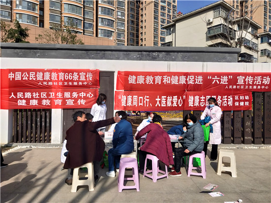 3月2日下午,在大慶路與七一路交叉口東北角的街頭游園內,人民路社區衛生服務中心在這里開展健康教育和健康促進“六進”宣傳活動。活動現場,量血壓、測血糖、免費體檢等服務,讓周邊居民體會到滿滿的關懷。