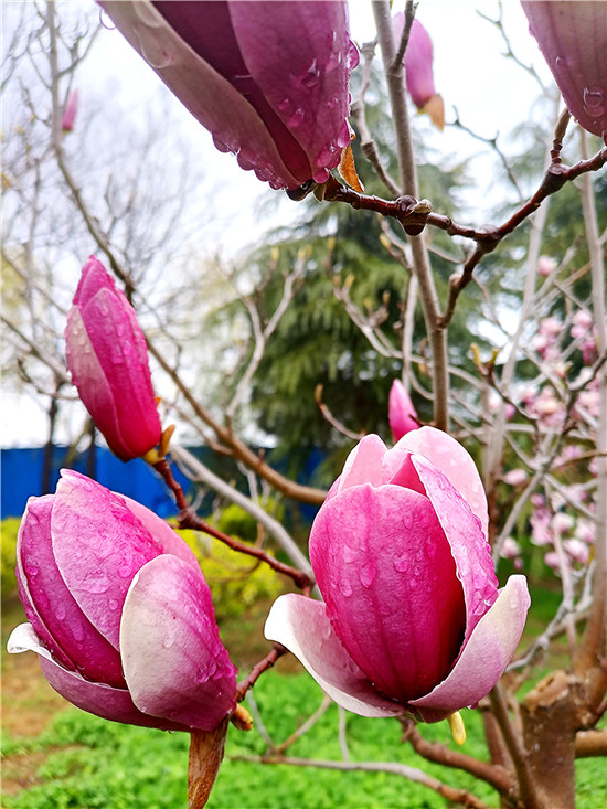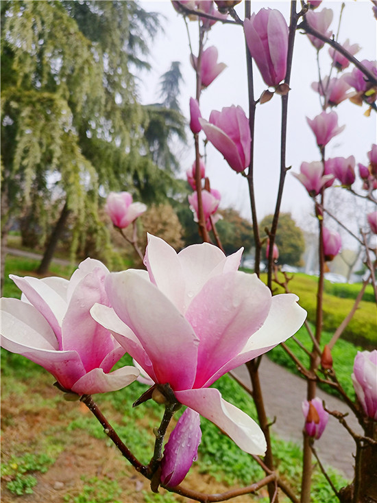 “霓裳片片晚妝新,束素亭亭玉殿春。已向丹霞生淺暈,故將清露作芳塵。”3月11日,我市下了一場小雨,路旁的紫玉蘭更顯晶瑩玉潤,朵朵玉蘭花如雨后新荷般清麗脫俗,或含苞待放、欲語還休,或花瓣盡展、舞姿翩翩,令人不禁駐足欣賞。