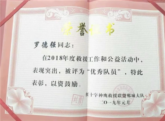 鄲城縣神鷹救援隊隊長劉勇說,正是看到了羅德強的優秀品質,2018年將羅德強吸納為神鷹救援隊員。“神鷹救援聯盟鄲城大隊隸屬于中國神鷹救援隊,由各個行業的志愿者組成,也是河南省成立最早的一支民間救援隊,除參加全國各地災后救援活動外,日常積極參加社會志愿者活動。”“我一個人的力量很有限,加入這個優秀集體,能夠學到更多專業救援知識,從而幫助更多的人,我感到非常驕傲和自豪。”羅德強說。2019年8月10日,受第九號臺風“利奇馬”影響,山東省壽光市、東營市等部分地區遭受洪災。8月11日晚上,紅十字神鷹救援聯盟鄲城大隊趕赴山東壽光救災。面對洪災,羅德強和其他救援隊員不畏辛苦,劃船深入各個受災鄉村救助被困群眾。壽光市一鄉鎮3處大閘因斷電出現險情,需要人力進行開閘泄洪。羅德強和隊員冒險攀爬到大閘上進行人工作業,經過3個多小時的奮戰,3處大閘全部打開,安全泄洪。2019年9月1日,參加泳渡日月潭返程途中,羅德強在福建高速公路上,發現前方車輛發生車禍,一名司機腿部骨折、血流不止。他立即下車和司機溝通,一邊報警,一邊利用專業救援知識打開變形的車門,順利將司機救出。“由于過度驚嚇,司機以骨折為由拒絕下車。當我告訴司機自己是神鷹救援隊員、救援技術過硬后,才同意我們施救。”當時高速上車流密集,情況十分危險,如果司機不能及時救出,后果不堪設想。“我們車輛加油、住宿、吃飯等救援費用都是隊員AA制負擔,從來不給當地政府或救助人添任何麻煩。”