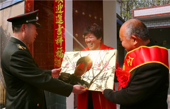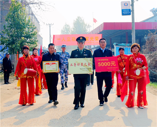 “來啦,來啦!”在鏗鏘激越的鑼鼓聲中,鹿邑縣人武部政委李峰、退役軍人事務(wù)局有關(guān)領(lǐng)導(dǎo)和賈灘鎮(zhèn)黨委、政府負(fù)責(zé)人一行人高舉“一人立功、全家光榮”的條幅闊步前來,共同將二等功臣馮秋月的立功喜報(bào)和“二等功臣之家”牌匾、獎(jiǎng)金、慰問品送到了她父母手中。村民紛紛趕來涌進(jìn)軍屬的庭院,為功臣馮秋月點(diǎn)贊,向她的家人鼓掌祝賀。