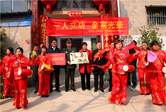 李峰說:“一張立功喜報(bào),不僅是軍人榮譽(yù)的象征、成長進(jìn)步的見證,也承載著軍人家屬的期盼與慰藉。功臣是實(shí)現(xiàn)強(qiáng)軍興軍目標(biāo)的尖兵,他們?cè)诓筷?duì)建功立業(yè),我們力所能及服務(wù)保障好他們的家人,積極在全社會(huì)營造起‘功臣受愛戴、軍人受尊崇、軍屬受尊敬’的氛圍。”為此,鹿邑縣人武部積極構(gòu)建軍人軍屬榮譽(yù)體系,每逢重大節(jié)日,都要協(xié)調(diào)地方黨委、政府開展為現(xiàn)役軍人和軍屬送喜報(bào),掛功臣匾、光榮牌等活動(dòng),通過活動(dòng)激勵(lì)等形式,讓軍人軍屬享有更多的“專屬榮光”,努力營造“一人參軍,全家光榮;一人立功,全村光榮”的濃厚氛圍,更加堅(jiān)定了軍屬支持子女獻(xiàn)身國防的決心,進(jìn)一步激發(fā)了鹿邑籍官兵獻(xiàn)身軍營、報(bào)效祖國的積極性。②9
