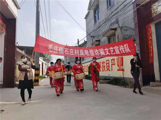 “父老鄉(xiāng)親聽我說,現(xiàn)在騙子真是多。莫占便宜要牢記,發(fā)家致富靠自己……”毛莊鎮(zhèn)石莊村這樣一支反電詐文藝宣傳隊瞬間吸引了人們的眼球。“現(xiàn)在我村的年輕人大部分都出去掙錢去了,在家的大部分是老人,我們幾個一合計把宣傳單上的內容編成順口溜,這樣更好懂、更好記!”石莊村文藝宣傳隊的張秀芬笑著說。