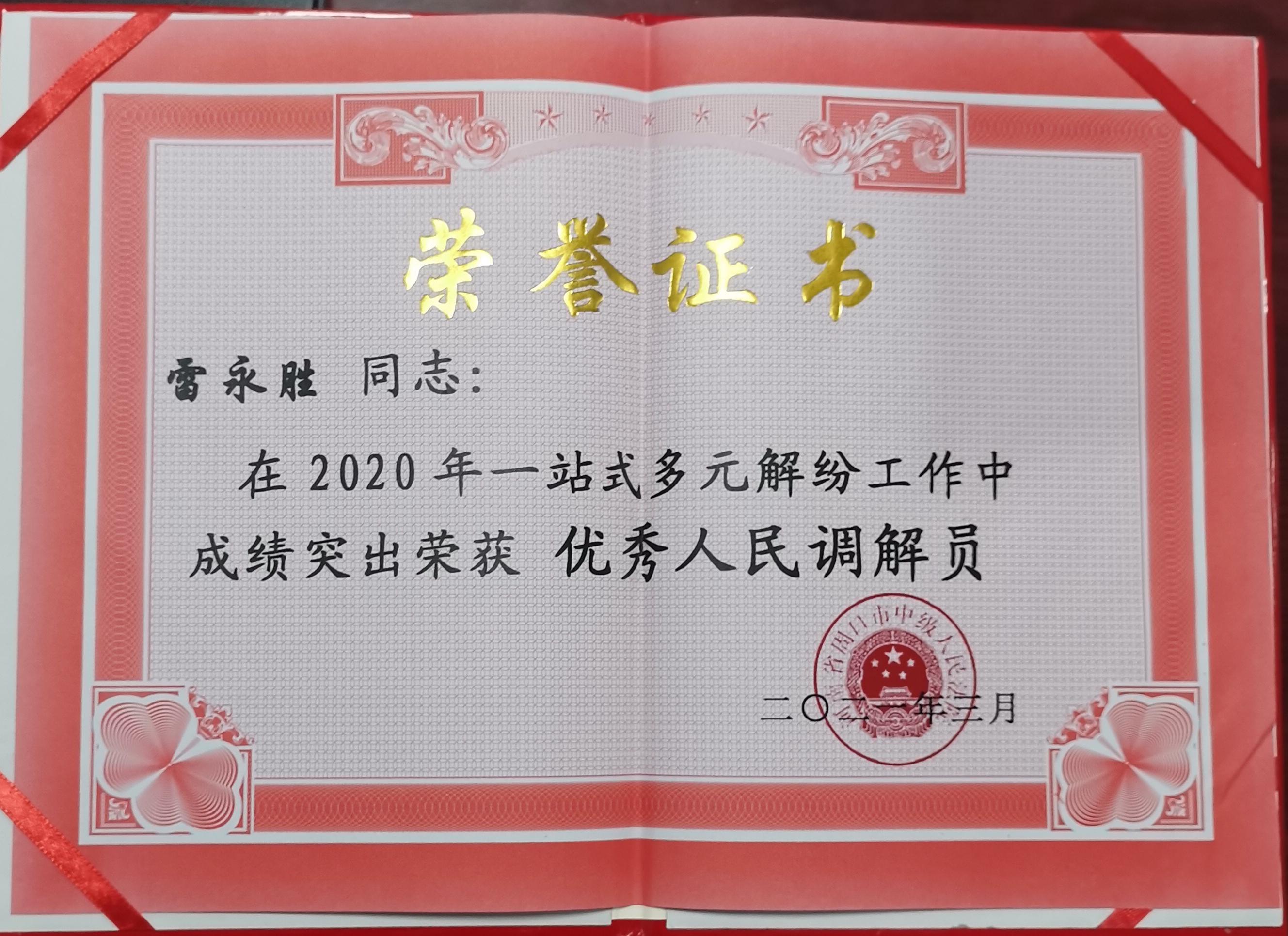 自2020年5月以來,雷永勝調解員已累計接受各類案件近200件,成功調解近百件,助力法院訴前調解工作邁入先進行列,化解了大量社會矛盾,為維護社會和諧穩定作出了積極貢獻。日前,雷永勝被周口市中級法院評為“2020年度優秀人民調解員”。