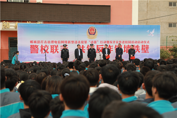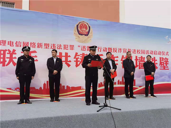 4月18日上午,鄲城縣打擊治理電信網絡新型違法犯罪“迅雷”行動暨反詐宣傳進校園活動儀式在縣三高啟動。縣政府副縣長、公安局長陳鳳祥,縣政府辦公室主任賈培民,縣教體局黨組書記、局長羅明黨等出席啟動儀式,縣打擊治理電信網絡新型違法犯罪工作各成員單位、縣公安局、縣三高分別組成代表隊2200余人參加啟動儀式,儀式由賈培民主持。