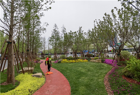 眼下雖不是詞中所描繪的初春時節(jié),但是暮春的水系風光更具詩情畫意。女媧路魚翔湖是一處以水凈化、水景觀、水科普為主的濱河濕地游園。漫步于此,新綠點綴其中,步道曲徑通幽,河水清澈透明,頓覺神清氣爽。沙河玉盤落珠節(jié)點,曲廊環(huán)繞,波光鱗鱗,垂柳慢舞,河流猶如飄帶蜿蜒流淌,一路步行聞花香聽鳥鳴,繪出一幅唯美畫卷。②9