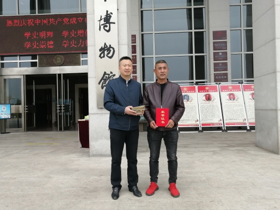 4月25日,周口市博物館收到周口市文昌辦事處李莊社區村委委員趙團結向捐贈的兩件唐代黃釉瓷碗,該文物對周口漕運史具有研究價值。周建山館長向趙團結頒發收藏證書,并感謝他對周口考古工作的支持。