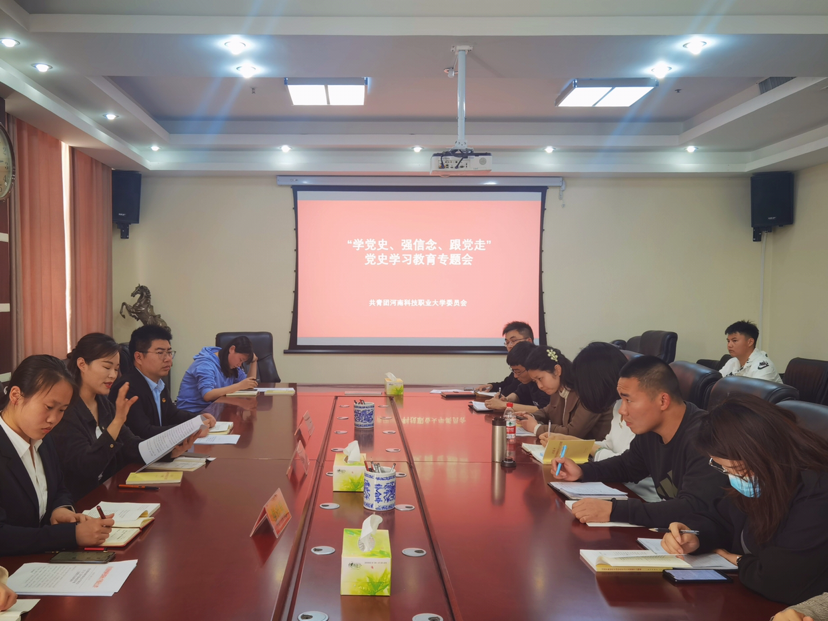 為認真貫徹習近平總書記在黨史學習教育動員大會上的重要講話精神,引領廣大黨員深入學習黨的歷史,深化青年厚植愛黨、愛國、愛社會主義的情感,4月29日,共青團河南科技職業大學委員會召開“學黨史、強信念、跟黨走"黨史學習教育專題會。