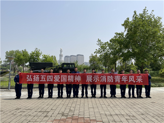 5月4日上午,天氣晴朗。在周口公園,周口市城鄉一體化示范區消防大隊的青年消防隊員們通過跑步訓練等方式慶祝五四青年節。消防隊員欒慶帥告訴記者:“今天是五四青年節,我們通過訓練、參觀國防設施這樣的方式,來表達我們的愛國熱情。”②9