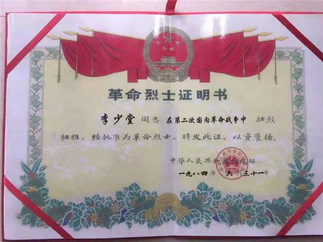 新中國成立后,李少堂的孫子才聯(lián)系上了李少堂曾經(jīng)的革命戰(zhàn)友惠浴宇同志。時(shí)任江蘇省省長的惠浴宇同志得知消息后,親寫證明遞交黨中央,這才證實(shí)了李少堂的身份。
