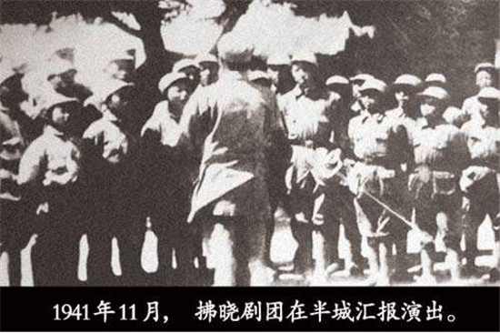1938年深秋,劇團(tuán)到泌陽縣鄧莊鋪演出,群眾自動(dòng)地找木棍、找門板、挖土埋柱子,很快搭起一座戲臺(tái),掛上幕布,點(diǎn)燃油燈,男女老少坐在戲臺(tái)前的空地上。戲臺(tái)上先是演員們合唱抗日歌曲《新四軍軍歌》《游擊隊(duì)歌》《到敵人后方去》等,后演出話劇《突擊》。當(dāng)劇中的老爺爺抱著被日寇殺死的孩子,含淚控訴敵人的暴行時(shí),臺(tái)下的觀眾禁不住地憤怒高呼:“打倒日本帝國主義!把日本鬼子趕出中國!”1939年11月初,徐海東隨劉少奇由竹溝到華中路過新興集,彭雪楓命拂曉劇團(tuán)組織一個(gè)晚會(huì),以示熱烈歡迎。拂曉劇團(tuán)接受任務(wù)后,大家爭分奪秒,只用了一天時(shí)間,就集體創(chuàng)作排練出京劇《徐海東粉碎日寇“掃蕩”》,第二天就在歡迎晚會(huì)上演出。